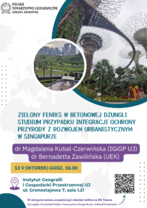 – „Zielony feniks w betonowej dżungli – studium przypadku integracji ochrony przyrody z rozwojem urbanistycznym w Singapurze” – dr Magdalena Kubal-Czerwińska i dr Bernadetta Zawilińska (13.05.2025r.)